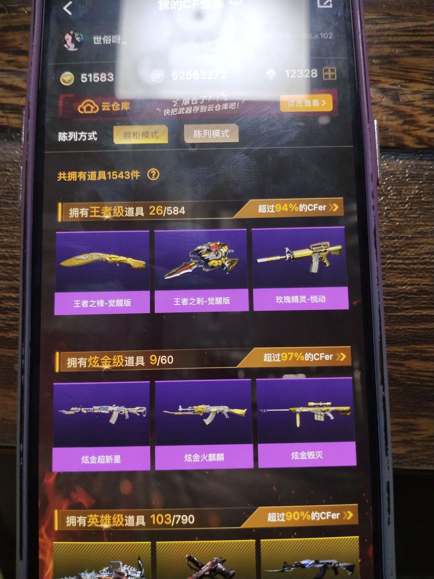 本游戏账号:英雄武器101个; 王者武器40个。 装备不多,但是主武器、副武器、近身武器够用 拥有完美游戏体验。重要的是,特殊装备有:麒麟刺、AK47-火麒麟、加特林-炼狱、M200-幻神、炫金天龙、炫金武士、炼狱-悦蓝、炫金火麒麟、王者之幻、炫金雷神、王者之戮、炫金毁灭、王者之势、王者之翼、王者之武、王者之心、王者之怒、王者之力、王者之光、王者之影、王者之魂、玫瑰精灵-悦动、火麒麟-AG、火麒麟-灵狐、王者之光-觉醒版、王者之心-觉醒版、王者之锋-觉醒版、王者之魄-觉醒版、堕天使、生化弹匣、M4A1-黑骑士音效卡、王者之魄金色光效、王者之心金色光效、炼狱-悦蓝金色光效、等,随意畅选。