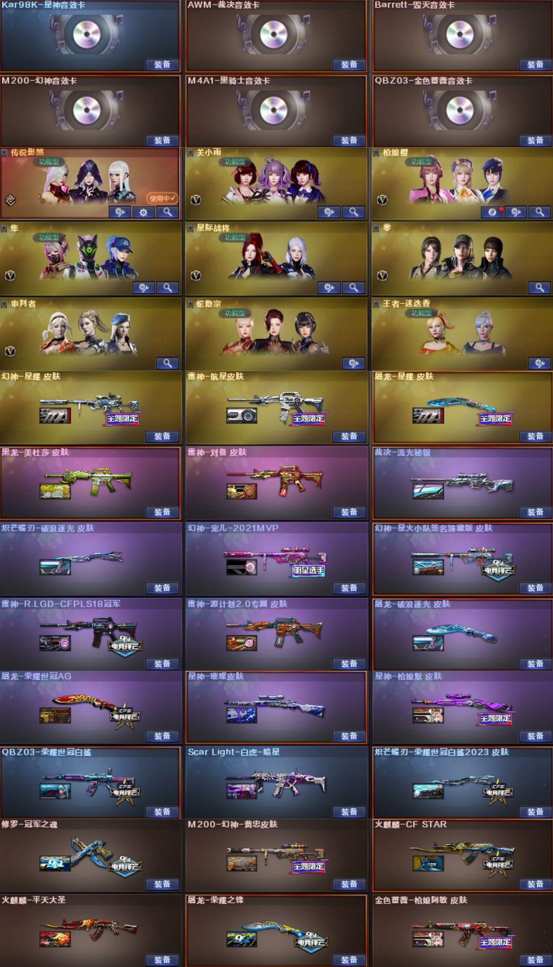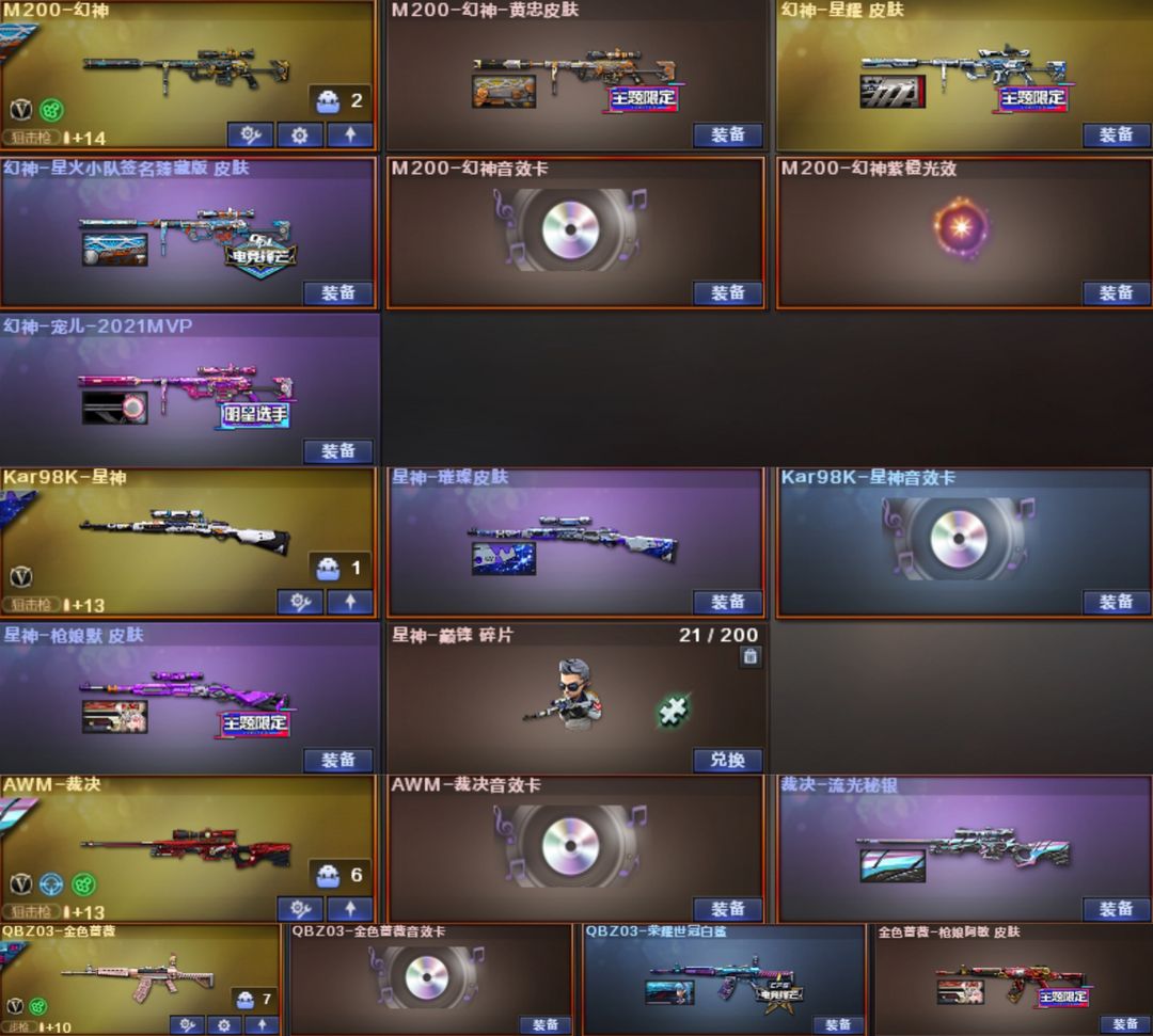 幽瞳,灵眸,圣谕,幻影,幻神+音效卡+星火+宠儿+星耀+黄忠,裁决+音效卡+流光秘银,星神+音效卡+璀璨+枪娘默,QBZ+音效卡+白鲨+枪娘阿敏,白虎九尾,王者风神,柯尔特-冠军之特,USP-冥王,柯尔特-白鲨,COP云龙*2,柯尔特-竞技荣光,传说幽冥,炽芒蝶刃-白鲨,传说影煞,关小雨,枪娘樱,隼等