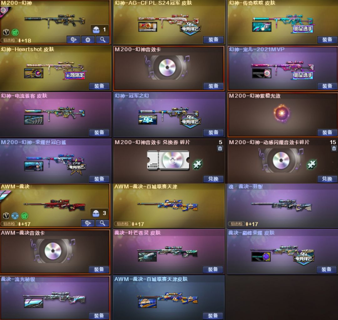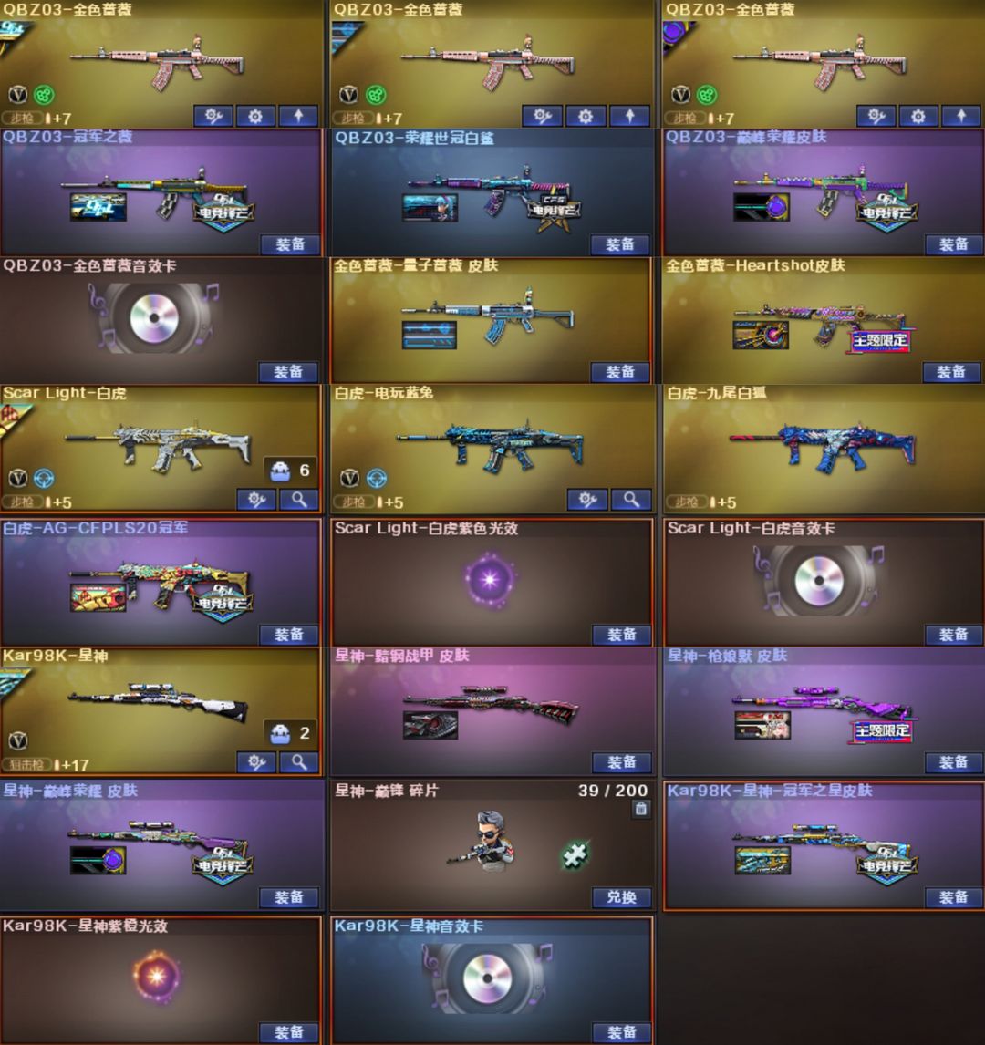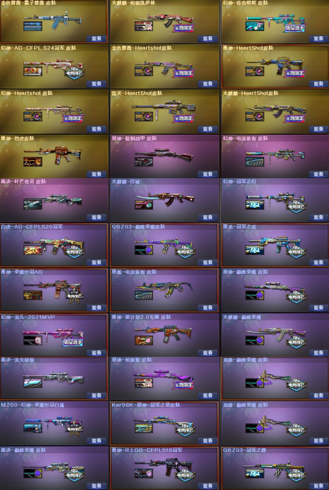 【传说影煞-传说幽瞳-传说灵眸-传说夜影】【幻神-AGS24冠军-传奇欧欧-Heartshot-宠儿-冠军之幻-白鲨2022-电流骇客-音效卡】【星神-黯钢战甲-冠军之星-巅峰荣耀-枪娘默-音效卡】【裁决-音效卡-巅峰荣耀-流光秘银-叶芒苍灵-百城】【白虎-AG冠军-白虎音效卡】【QBZ03-冠军之薇-Heartshot-量子蔷薇-白鲨-巅峰荣耀-音效卡】【玄豹】【天戎】【幻影】【柯尔特-白鲨*3】【USP-雷暴】【USP-雷暴王者】【USP-冥王】【柯尔特-冠军之特*2】【COP*3】【炽芒蝶刃】【云悠悠-关小雨-荒漠琉璃-晴雅-王者复仇-王者凌霄-王者潘多拉-王者沙漠玫瑰-王者影豹-王者雨墨-隼-空】