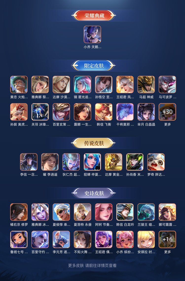 本游戏账号: ,英雄多,皮肤多。典藏皮肤1个,感受典藏皮肤带来的优质体验快感,FMVP皮肤3个,尽情享受FMVP皮肤带来的主角光环, 私人所属英雄皮肤有:小乔 天鹅之梦孙尚香 末日机甲||狄仁杰 超时空战士||貂蝉 仲夏夜之梦||达摩 黄金狮子座干将莫邪 久胜战神||西施 游龙清影||镜 炽阳神光关羽 冰锋战神||孙悟空 至尊宝||孙膑 寅虎·展翼||干将莫邪 冰霜恋舞曲||李信 一念神魔||王昭君 凤凰于飞||百里玄策 白虎志||芈月 白晶晶||达摩 沙漠行僧||镜 匿光追影者||雅典娜 黎明之约||露娜 一生所爱||韩信 飞衡||马可波罗 暗影游猎||马超 神威||黄忠 火炮绅士,等等