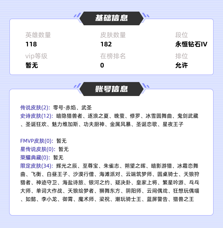 毁号,涉及毁坏虚拟财产罪及计算机安全罪,请文明游戏素质游戏,让我们共建美好租号平台 本游戏账号: V8用户基础段位:永恒钻石IV英雄多皮肤多。典藏皮肤3个感受典藏皮肤带来的优质体验快感 私人所属英雄皮肤有:孙悟空 全息碎影夏侯惇 无限飓风号小乔 天鹅之梦赵云 淬星耀世虞姬 启明星使吕布 天魔缭乱李白 凤求凰武则天 海洋之心后羿 黄金射手座杨戬 永曜之星诸葛亮 武陵仙君孙尚香 末日机甲孙悟空 地狱火等等 注意事项: A.游戏过程中请不要恶意挂机或者不文明发言B.恶意挂机、顶号等行为将被拉黑无法再次下单C.进入游戏后中途请勿退出登陆,否则无法再次上号D.部分账号由于异地登录可能会出现密码错误提示,通常再尝试5-6次后可上号。 喜欢本账号请点 ☆收藏☆ 方便下次租用,谢谢光临惠顾