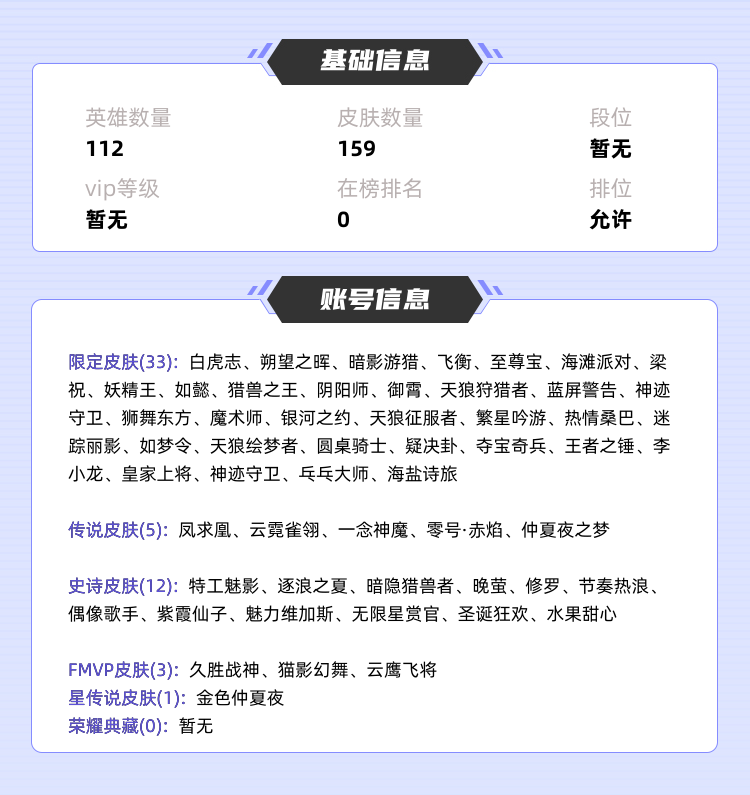 本游戏账号: ,英雄多,皮肤多。FMVP皮肤3个,尽情享受FMVP皮肤带来的主角光环, 私人所属英雄皮肤有:李信 一念神魔||李白 凤求凰||孙悟空 零号·赤焰||虞姬 云霓雀翎||貂蝉 仲夏夜之梦干将莫邪 久胜战神||曜 云鹰飞将||貂蝉 猫影幻舞项羽 海滩派对||赵云 皇家上将||鲁班七号 狮舞东方||蔡文姬 繁星吟游||女娲 朔望之晖||曹操 天狼征服者||盾山 圆桌骑士||裴擒虎 天狼狩猎者||裴擒虎 李小龙||钟馗 神迹守卫||吕布 猎兽之王||钟无艳 王者之锤||马可波罗 暗影游猎||孙膑 妖精王||鲁班大师 乓乓大师||阿轲 迷踪丽影||妲己 热情桑巴||上官婉儿 梁祝||上官婉儿 天狼绘梦者||孙悟空 至尊宝||李元芳 银河之约||安琪拉 如懿||明世隐 疑决卦||桑启 海盐诗旅||韩信 飞衡||墨子 神迹守卫||狄仁杰 阴阳师||狄仁杰 魔术师||后羿 如梦令||刘邦 夺宝奇兵||百里玄策 白虎志||米莱狄 御霄||典韦 蓝屏警告,等等