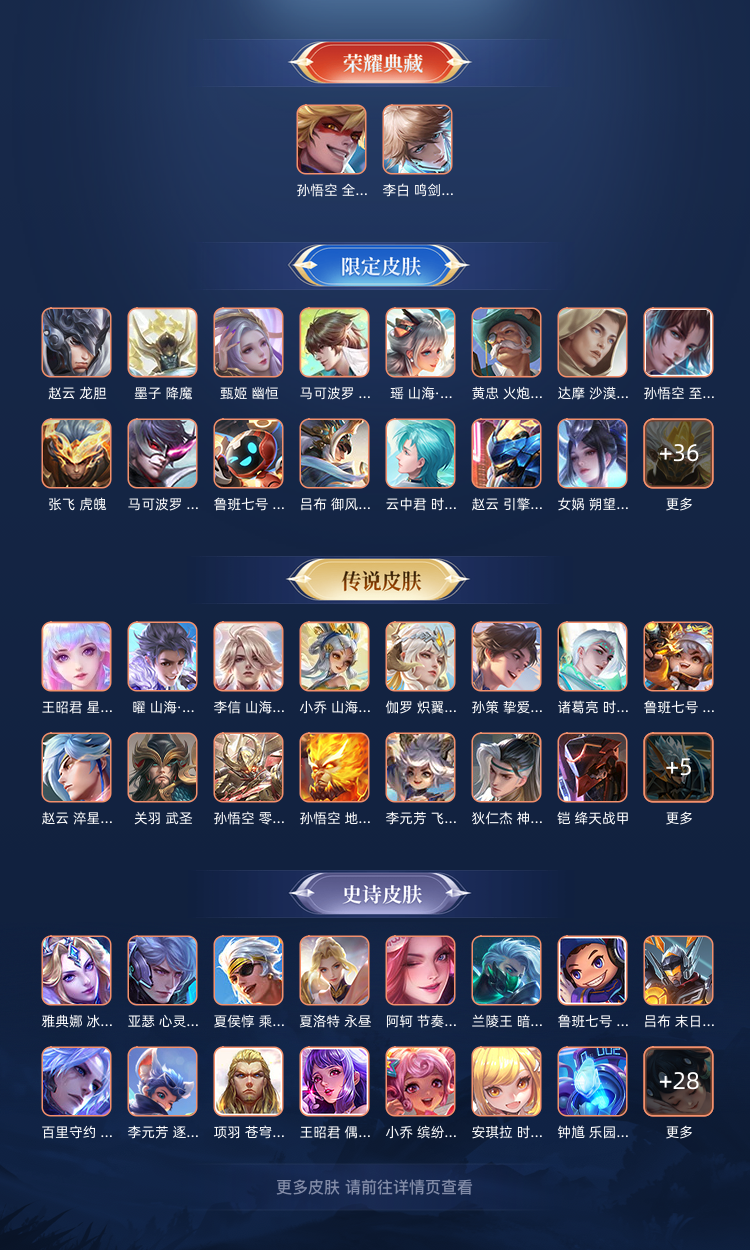 本游戏账号: V10用户,基础段位:最强王者,英雄多,皮肤多。铭文:0-10,典藏皮肤2个,感受典藏皮肤带来的优质体验快感,FMVP皮肤3个,尽情享受FMVP皮肤带来的主角光环, 私人所属英雄皮肤有:孙悟空 全息碎影||李白 鸣剑·曳影孙悟空 地狱火||后羿 黄金射手座||关羽 武圣||孙悟空 零号·赤焰||虞姬 启明星使||诸葛亮 时雨天司||铠 绛天战甲||李元芳 飞鸢探春||赵云 淬星耀世||孙尚香 异界灵契||鲁班七号 寅虎·瑞焰||孙策 末日机甲||孙策 挚爱之约||娜可露露 前尘镜||橘右京 枫霜尽||百里守约 碎云||不知火舞 绯月行||狄仁杰 神器·狴犴令||李白 诗剑行||孙尚香 音你闪耀||王昭君 星穹之声||曜 山海·苍雷引||李信 山海·炽霜斩||小乔 山海·琳琅生||孙悟空 齐天大圣||伽罗 炽翼辉光||干将莫邪 画中仙||花木兰 燃星之曲||项羽 无限倾心||虞姬 无限倾心||亚瑟 追逃游戏||诸葛亮 鹤羽星尊||云缨 鹤归松栖||宫本武藏 惊梅引||