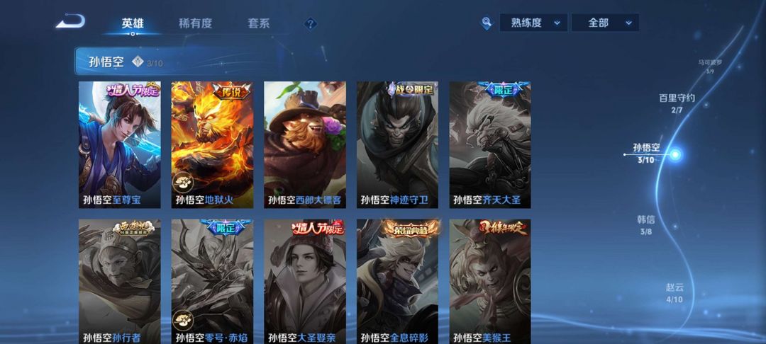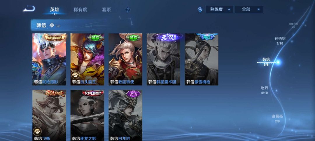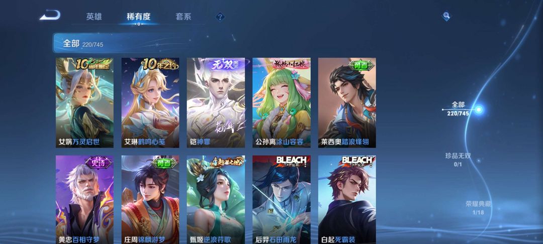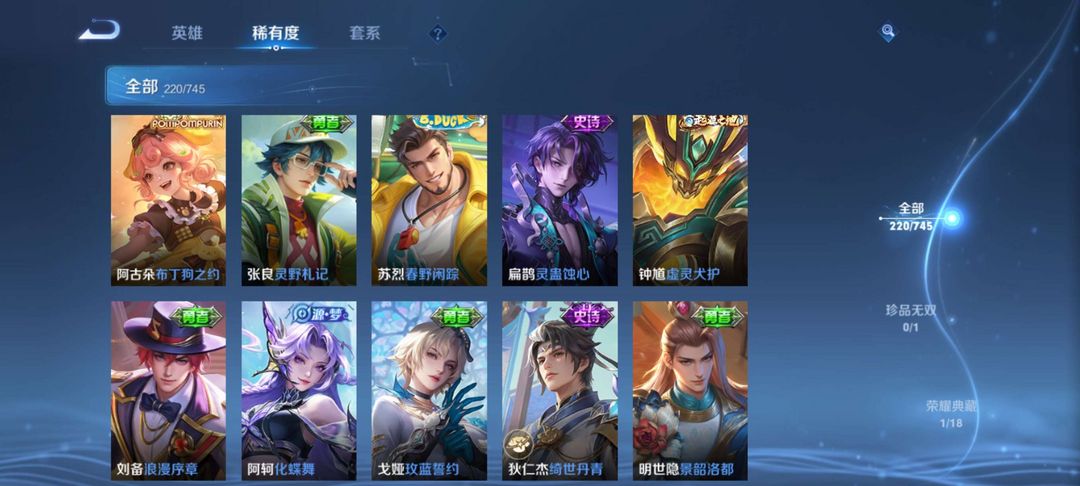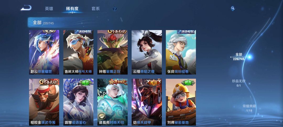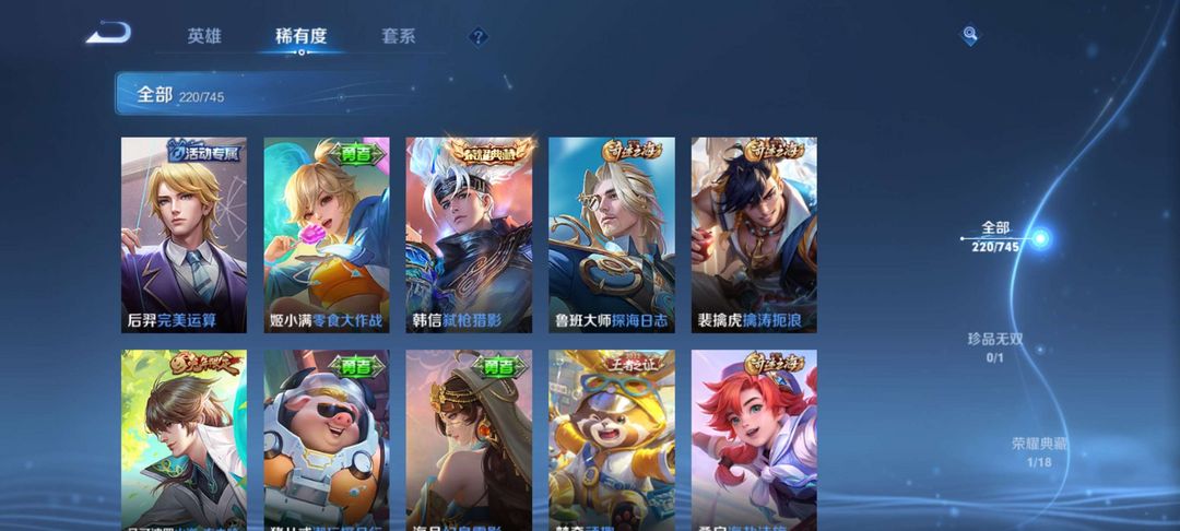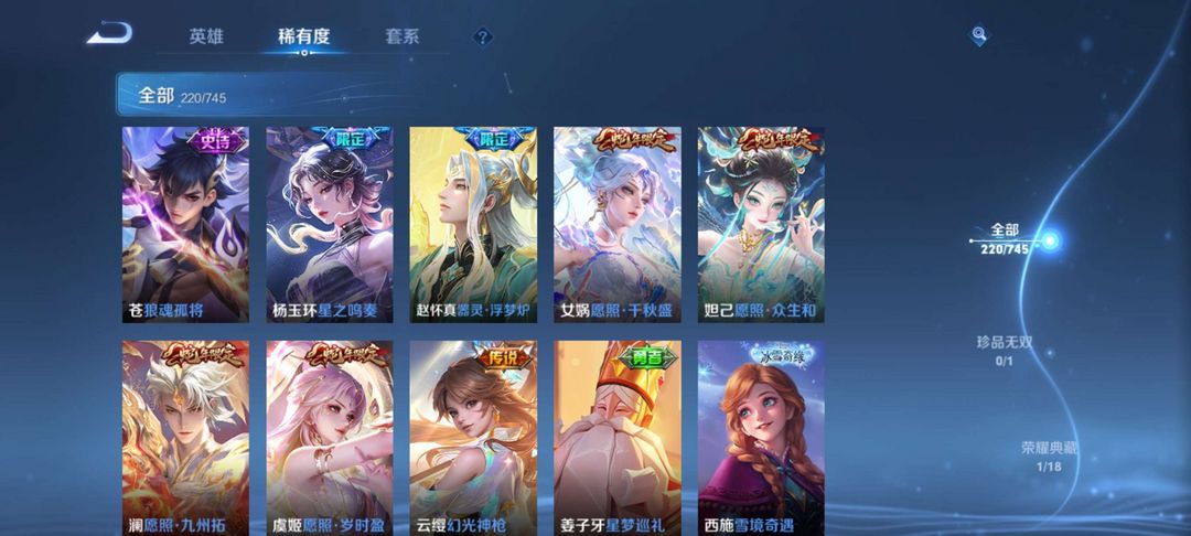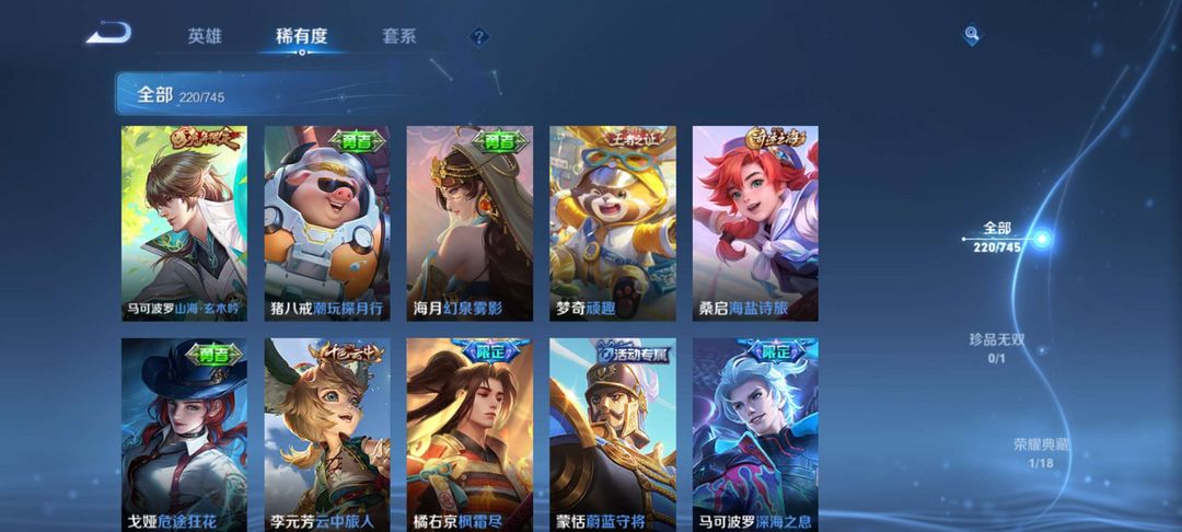 贵族等级V8,段位无双王者,英雄数量127,典藏皮肤数1,皮肤数量230,至尊宝/圣诞老人/久胜战神/愿照·九州拓/愿照·众生和/霜北刀/逐花归海/碎月剑心/愿照·千秋盛/深海之息/愿照·岁时盈/弑枪猎影/炽阳神光/神罪/至尊宝/圣诞老人/久胜战神/愿照·九州拓/愿照·众生和/霜北刀/逐花归海/碎月剑心/愿照·千秋盛/深海之息/愿照·岁时盈/弑枪猎影/炽阳神光/神罪