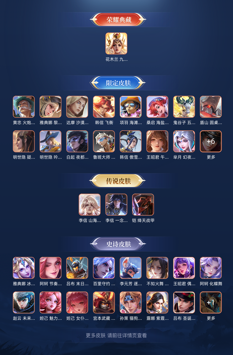 一个花木兰典藏,打野和对抗的皮肤多点,孙策的猫狗日记,铠的绛天战甲。