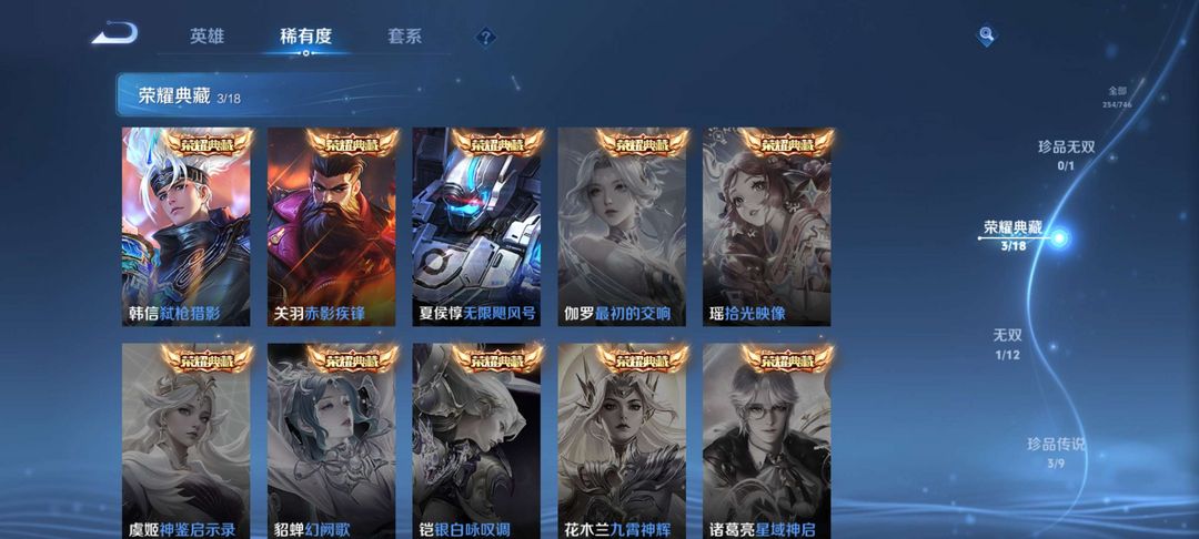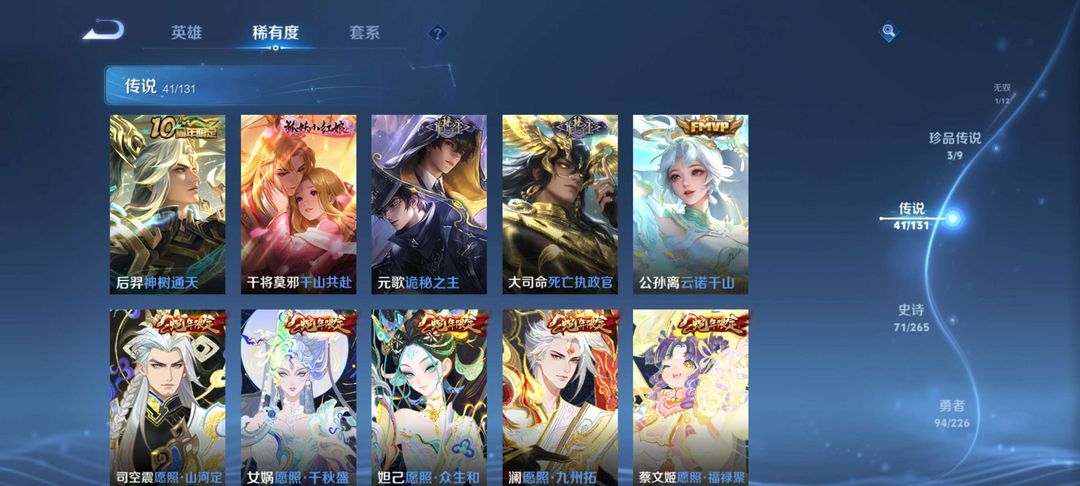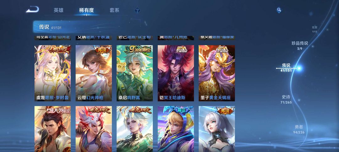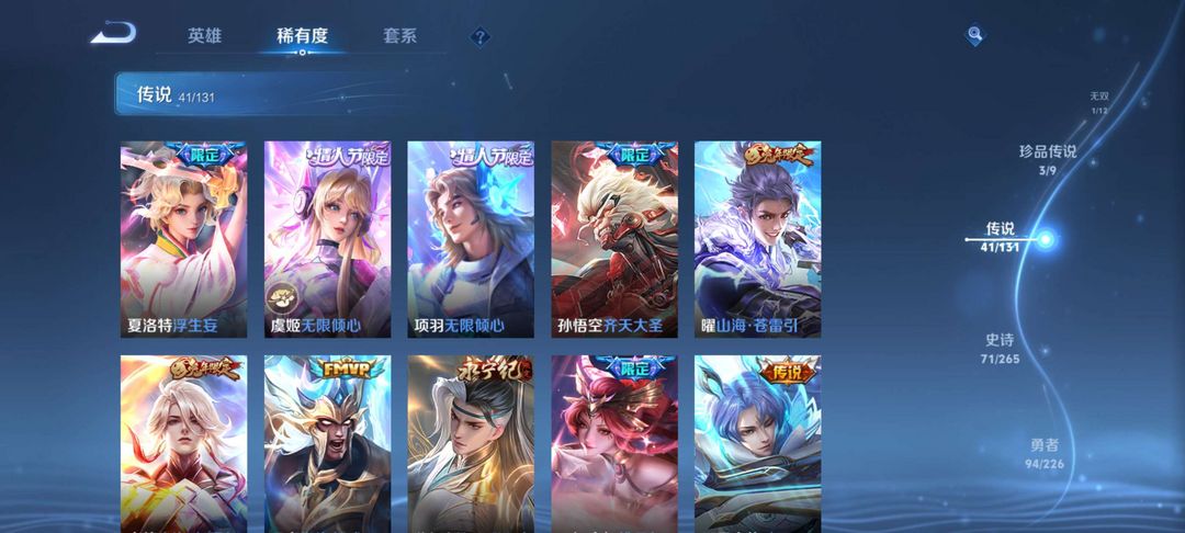 很多限定皮肤,41个传说3个荣耀水晶,很多史诗